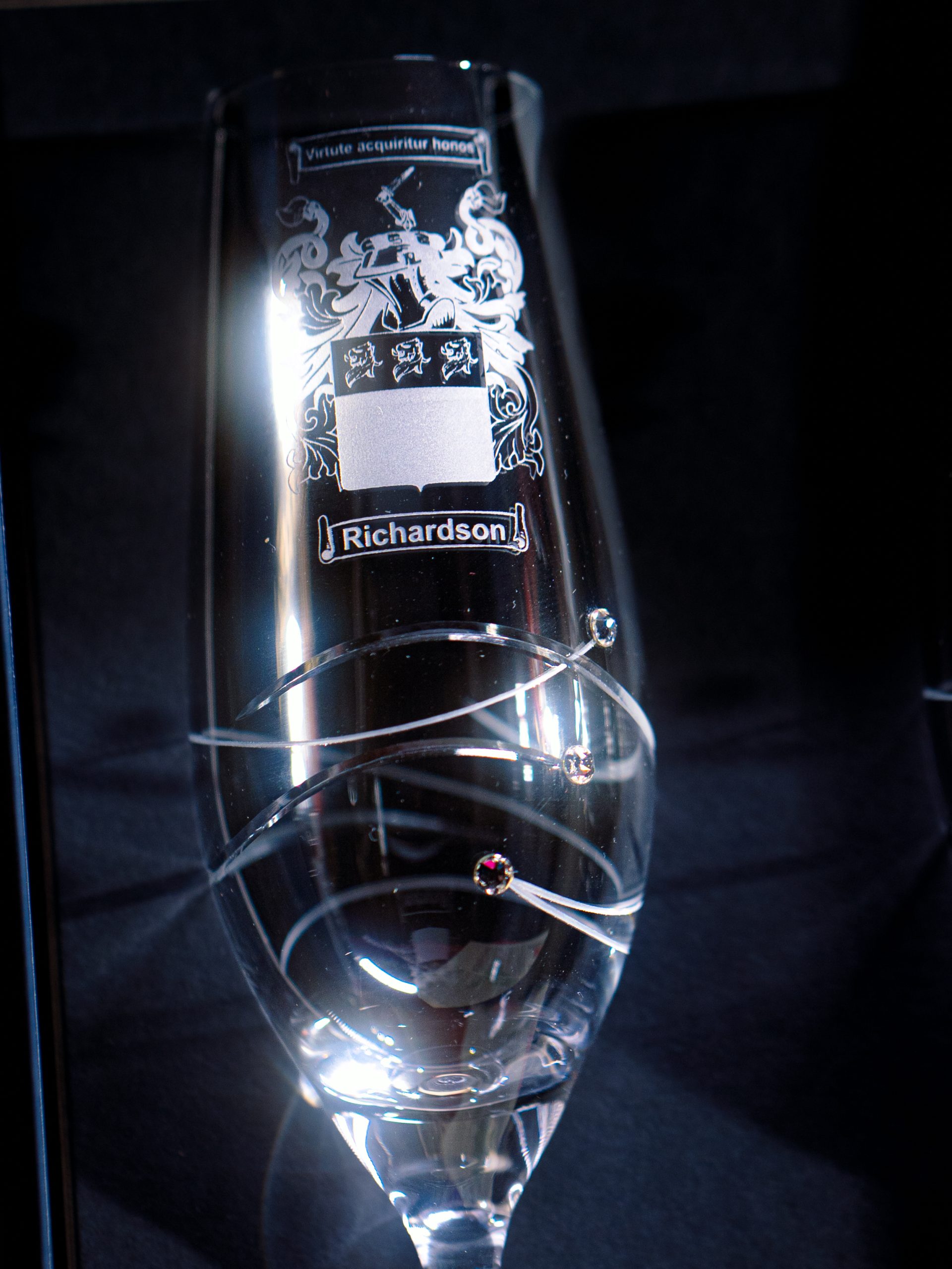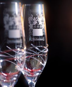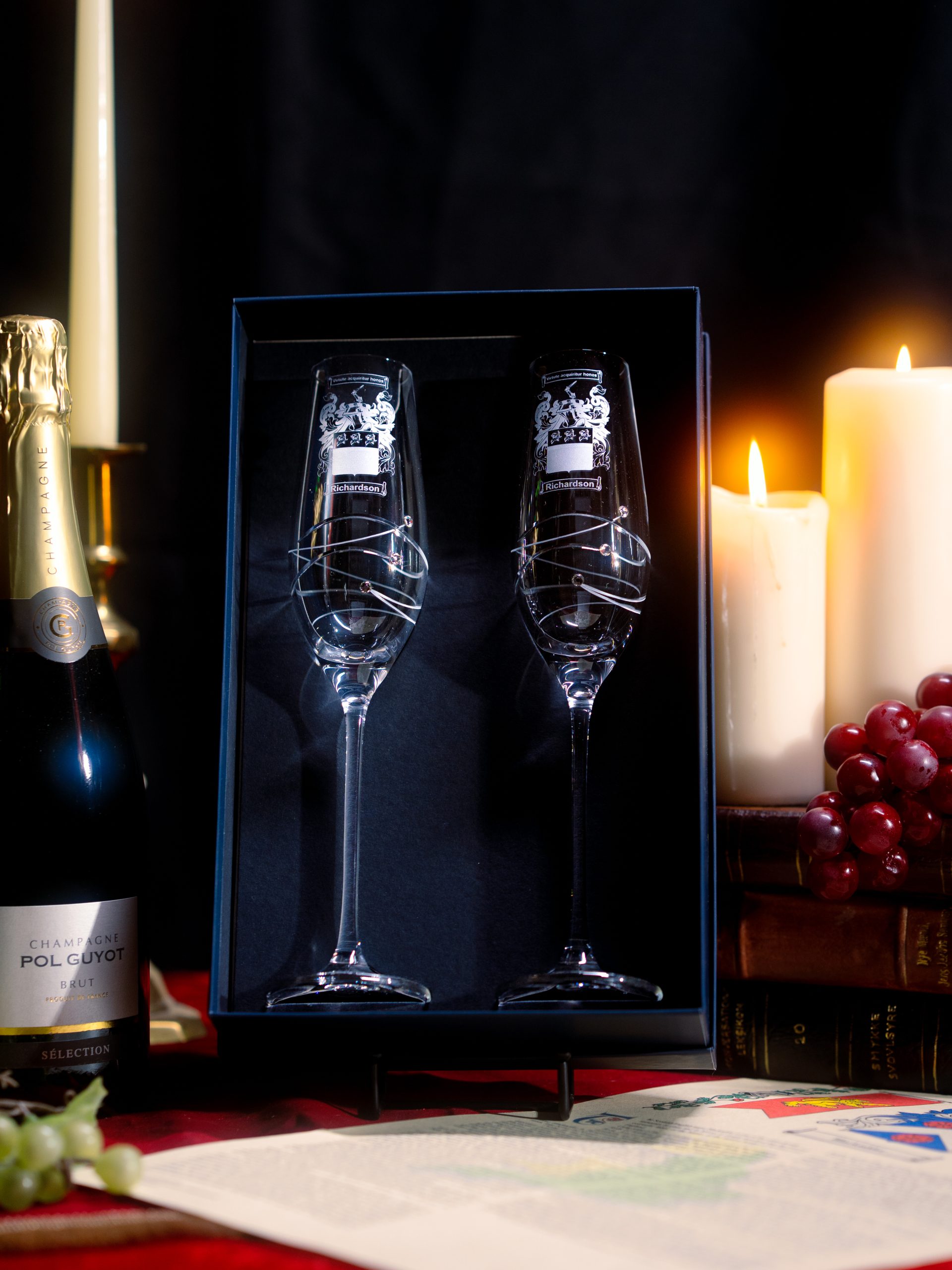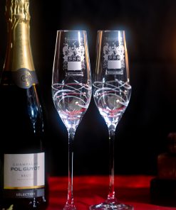 The Diamante champagne flute set would make an ideal engagement, wedding or anniversary gift. The set comprises of 2 champagne flutes with heart shaped cutting and featuring 3 Swarovski crystals bonded to the side of the flute. They are packed in a satin lined presentation box and can be engraved with any crest, logo or wording to create a gift that is sure to be treasured by the recipient.